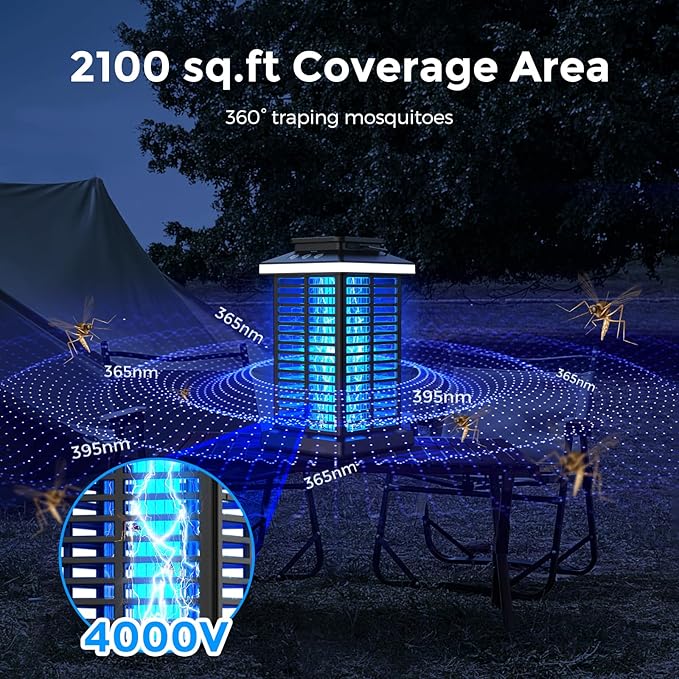 • 【High Effective Mosquito Zapper Lamp】This bug zapper outdoor lamp uses 360°range 365-395nm wavelength UV light to attract insects, then shock them by 4000V high-voltage electrical grid in physical method, it can effectively kill thousands of flies, mosquitoes, wasps, moths and other insects. Protects you and your family from pest infestations.