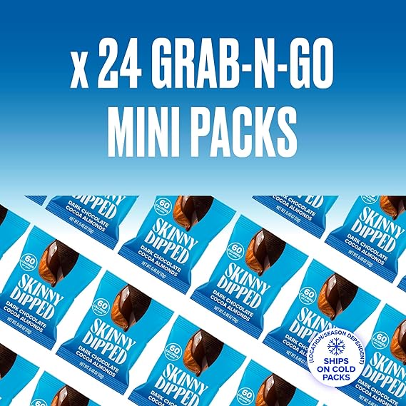 - PERFECT PORTIONS: Best enjoyed anytime, anywhere. Dive in! Each mini bag is 60 calories and is sized to be the ideal on-the-go snack. This pack includes (24) 0.46 oz bags of SkinnyDipped Dark Chocolate Cocoa Almonds.